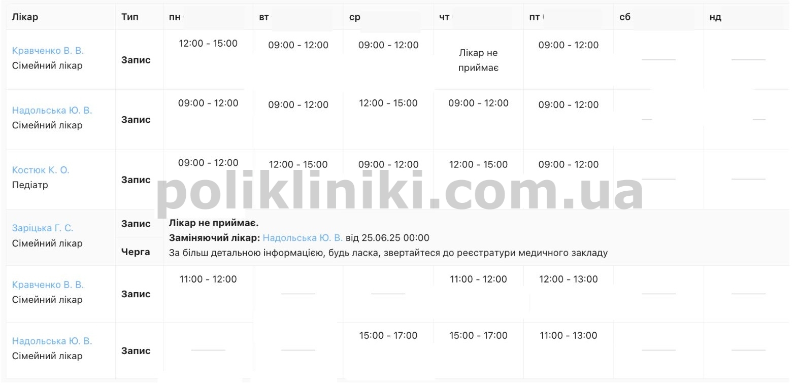 | 16 | Сімейний лікар | Хитрук О.О. | 12.00 - 15.00 | 9.00 - 12.00 | 12.00 - 15.00 | 9.00 - 12.00 | 12.00 - 15.00 |